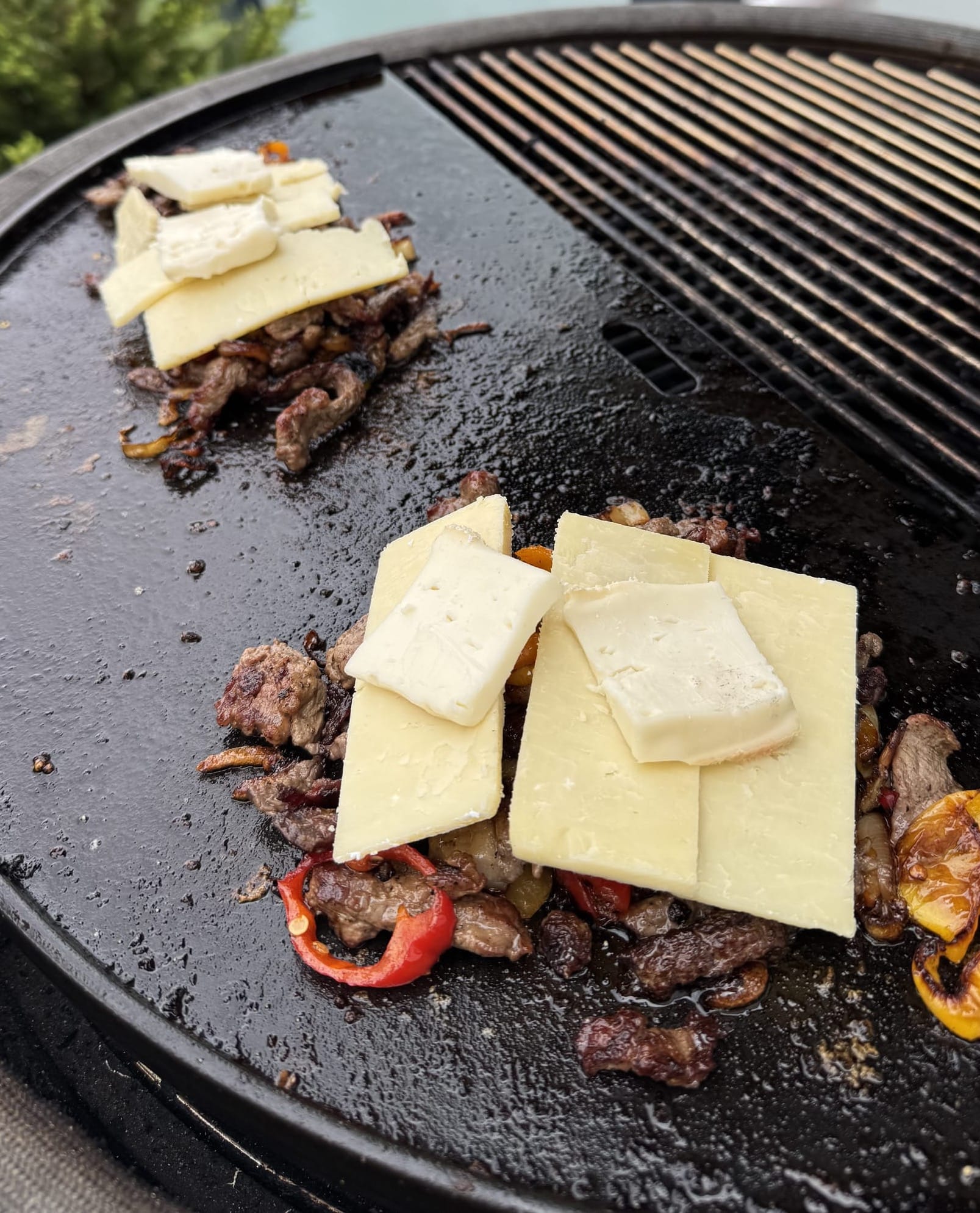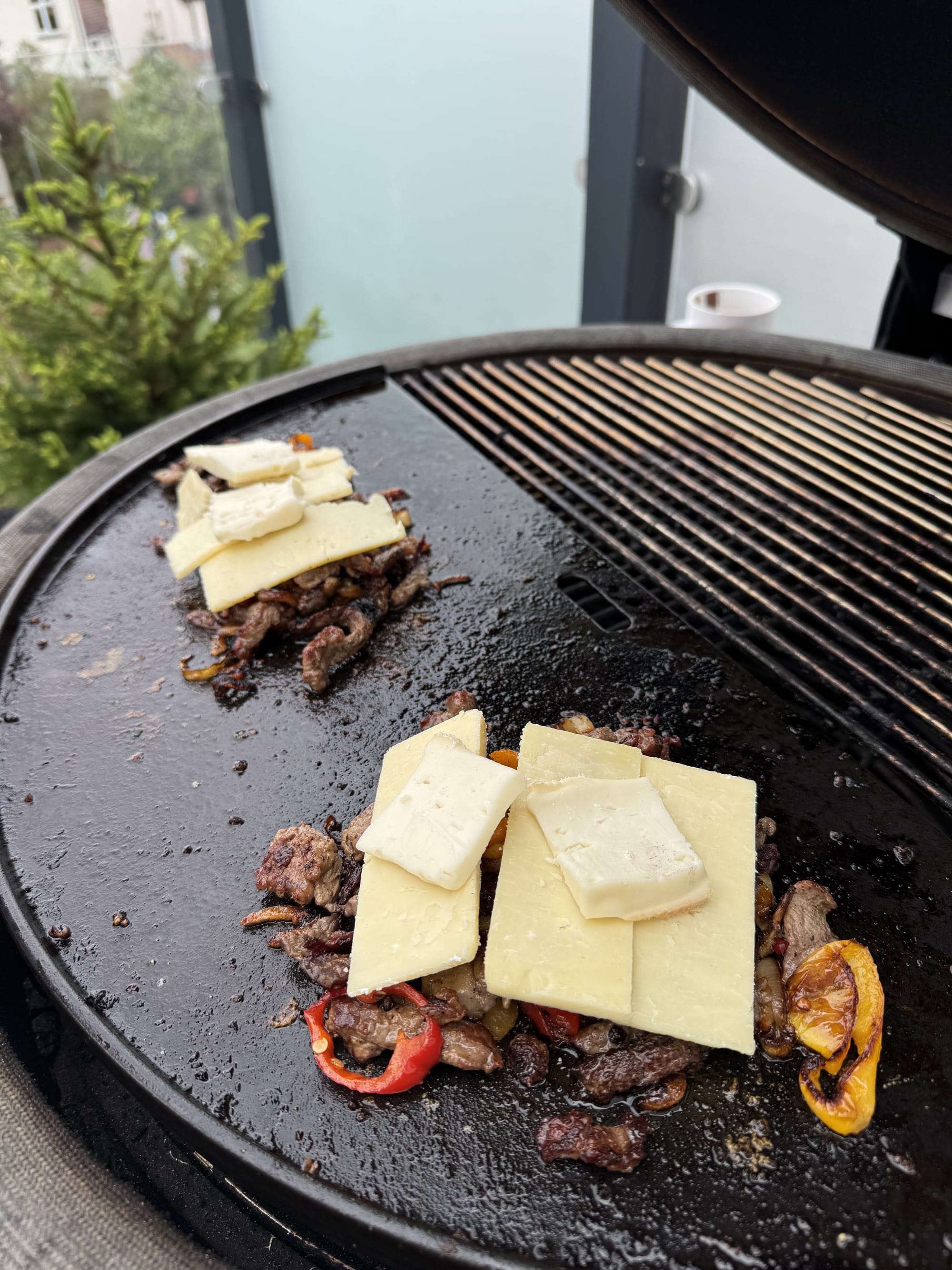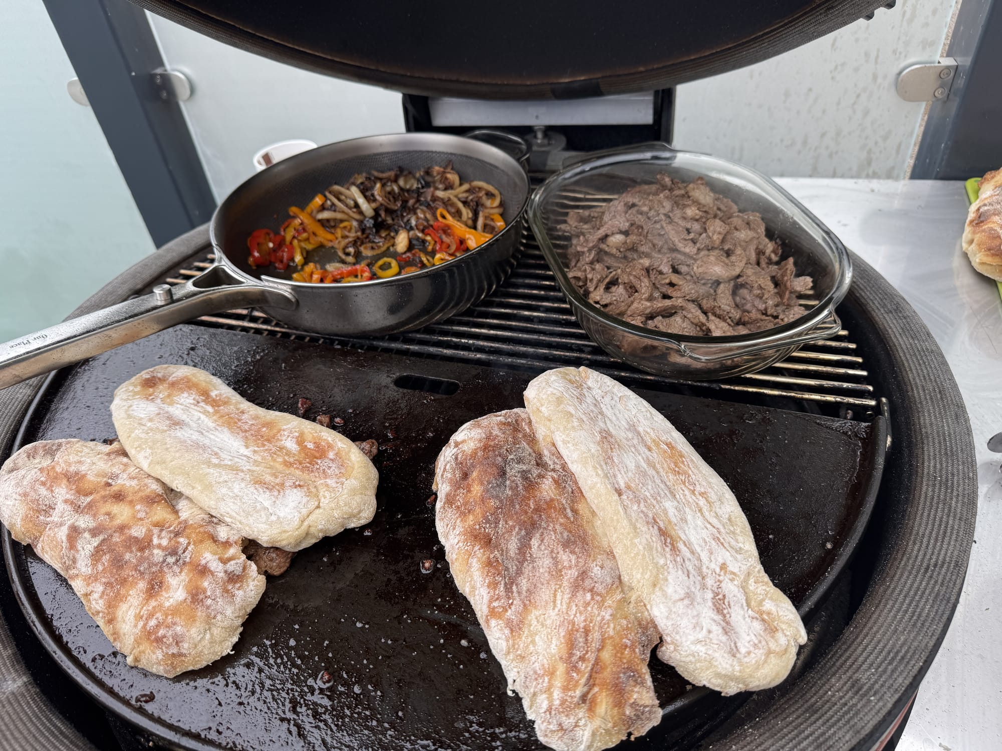 And here's where we reach the crux of this entire enterprise – the cooking method. Not some indoor electric griddle, not a frying pan on the hob, but a cast-iron plate set atop glowing coals in a ceramic Kamado grill, with chunks of whiskey barrel wood adding a subtle smokiness. There's something primitively satisfying about cooking meat over fire outdoors, even when that meat is destined for something as seemingly humble as a sandwich. The gentle spitting of fat hitting hot metal, the rising wisps of smoke carrying the aromas of beef and sweet onions, the way the slices of pepper blister and char at the edges – it's theatre as much as cookery.