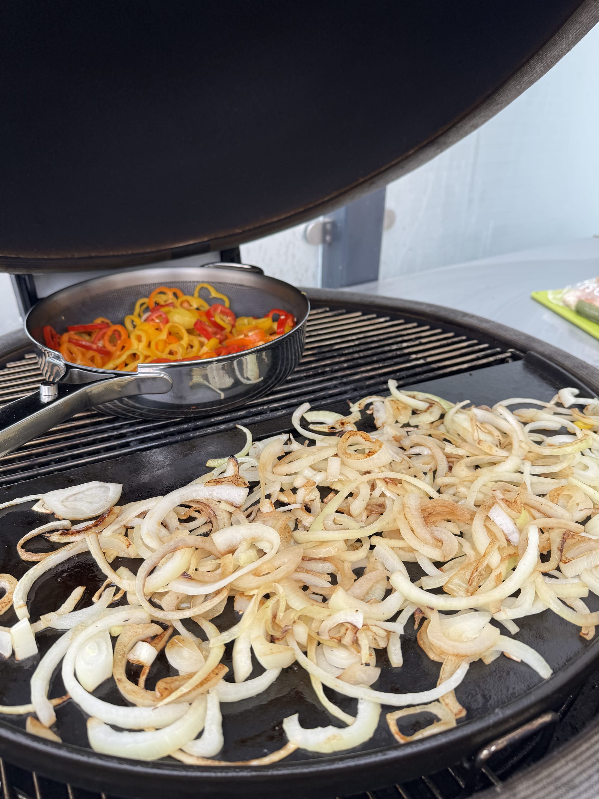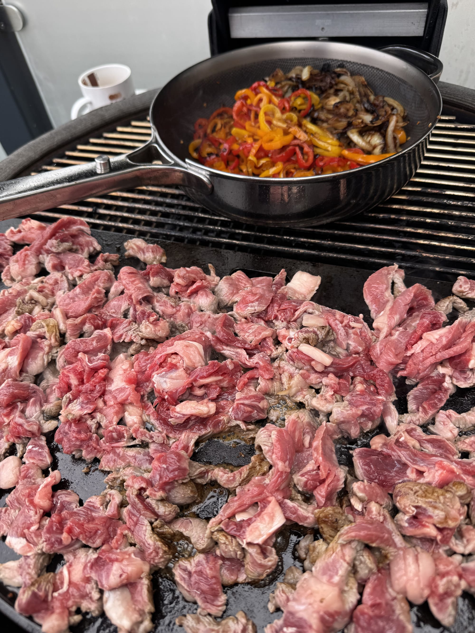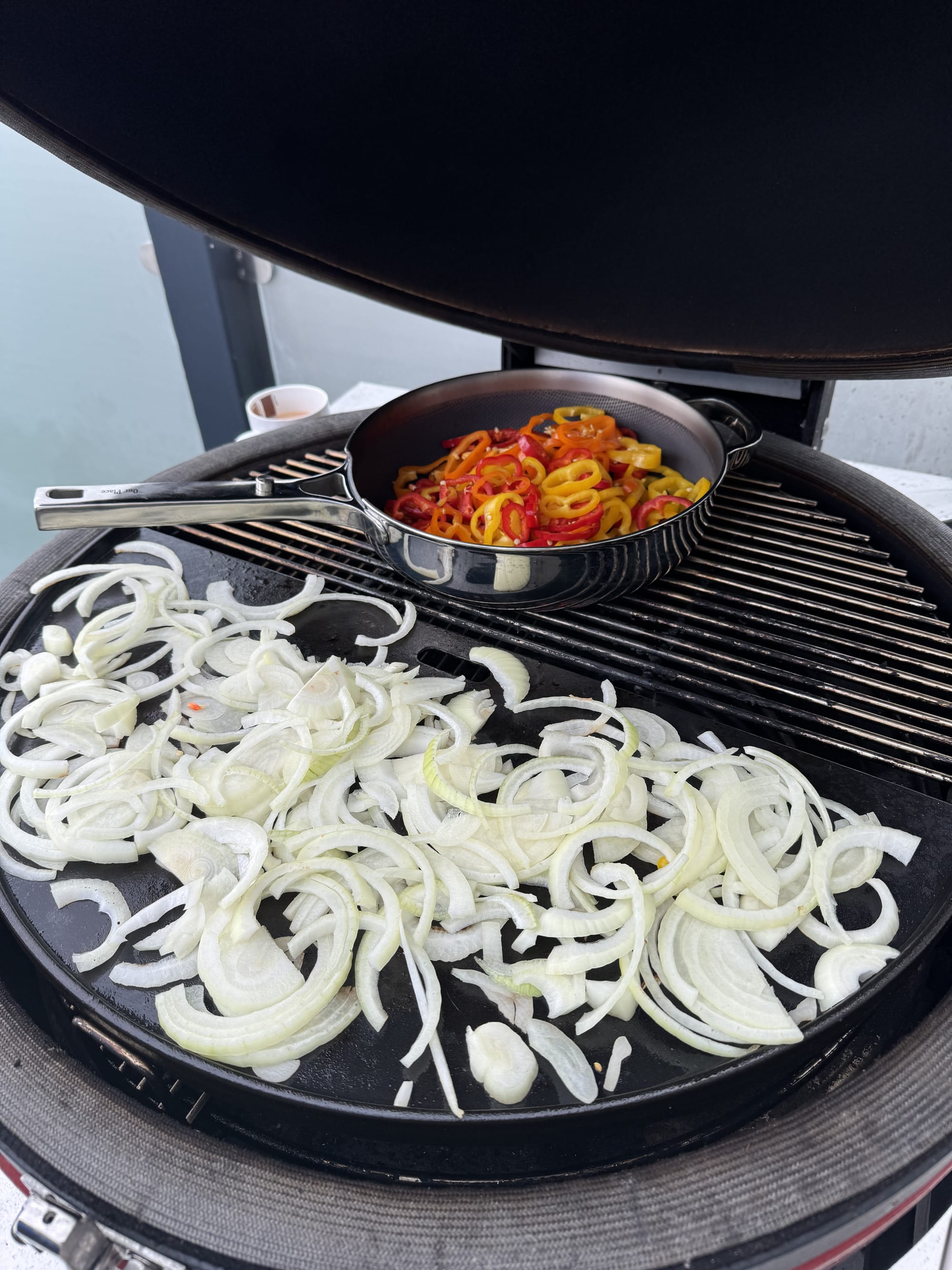 And here's where we reach the crux of this entire enterprise – the cooking method. Not some indoor electric griddle, not a frying pan on the hob, but a cast-iron plate set atop glowing coals in a ceramic Kamado grill, with chunks of whiskey barrel wood adding a subtle smokiness. There's something primitively satisfying about cooking meat over fire outdoors, even when that meat is destined for something as seemingly humble as a sandwich. The gentle spitting of fat hitting hot metal, the rising wisps of smoke carrying the aromas of beef and sweet onions, the way the slices of pepper blister and char at the edges – it's theatre as much as cookery.