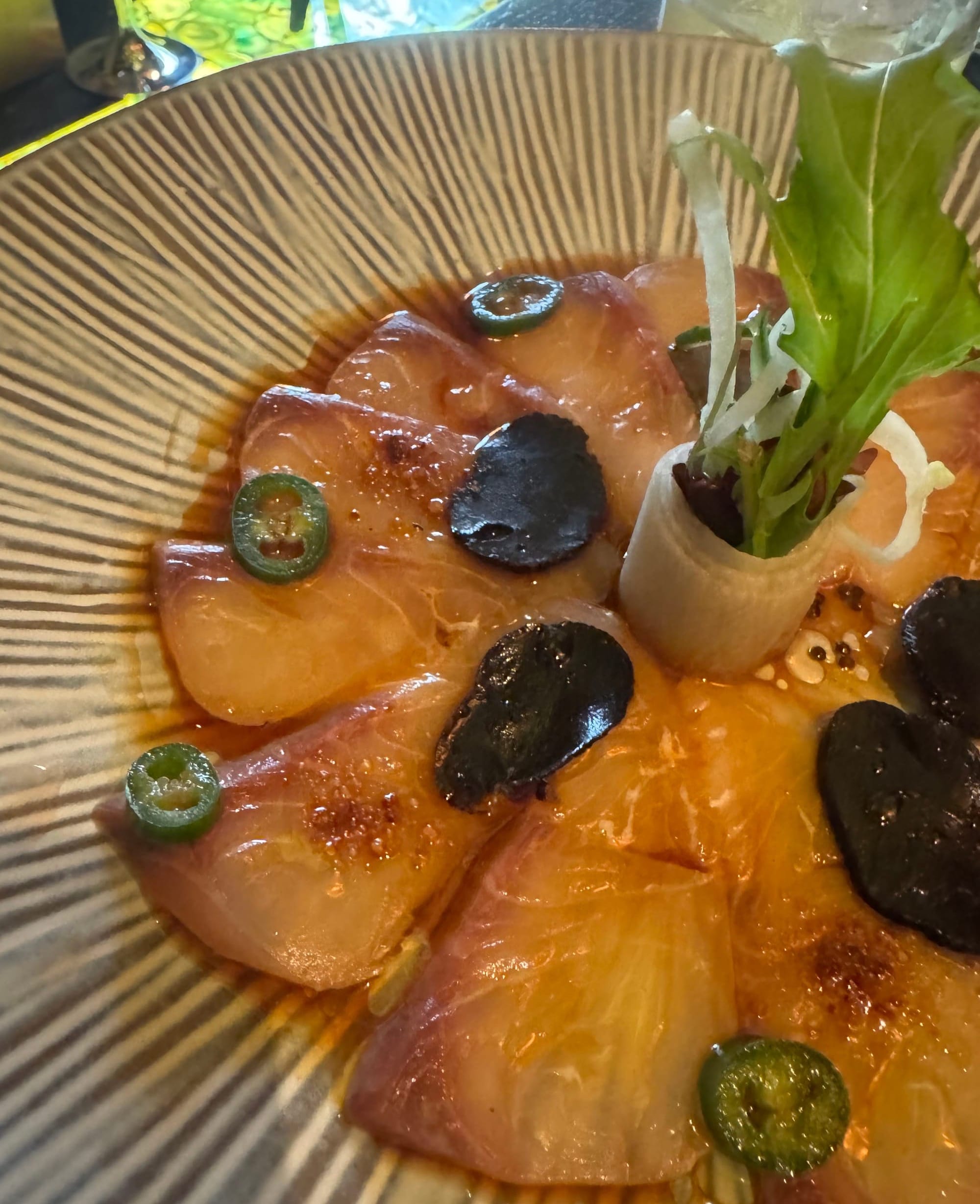 Everything we had to start was exemplary. The yellowtail sashimi (£10.25) arrived as translucent petals of fish in a striped ceramic bowl, adorned with slices of green chilli and black truffle that provided vivid punctuation marks against the blush-pink flesh. The fish dissolved on the tongue with barely any encouragement, elevated by a yuzu dressing that brightened each mouthful like a shaft of sunlight through Easter bank holiday storm clouds. The seared wagyu maki rolls offered a pleasant BBQ glazing, though at £17.50, I'd have expected the beef to serenade me personally. The pork and kimchi gyoza (£10.75), however, were the true stars – plump parcels of porky pleasure where the assertive kimchi was cleverly tamed by fresh coriander, a pairing so inspired I mentally added it to my repertoire of kitchen experiments to attempt at home.